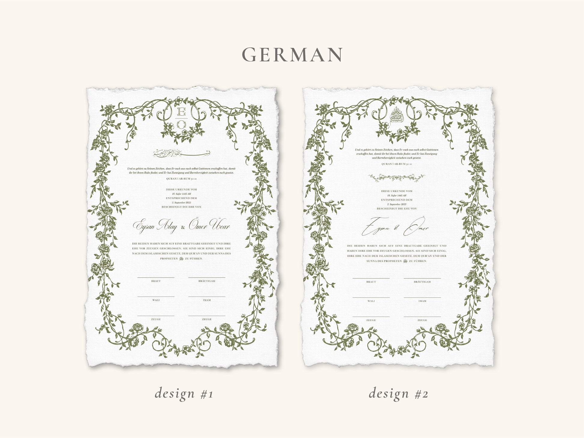 The certificate and folio are provided in DIN A4 size. For DIN A3 certificates, please view our collection “A3 Nikkah Certificates” on our website.