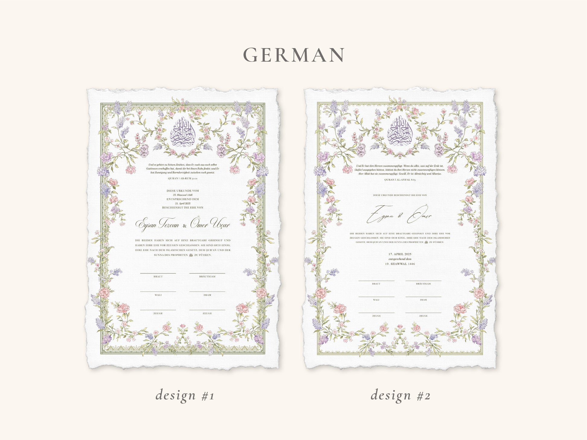 The certificate and folio are provided in DIN A4 size. For DIN A3 certificates, please view our collection “A3 Nikkah Certificates” on our website.