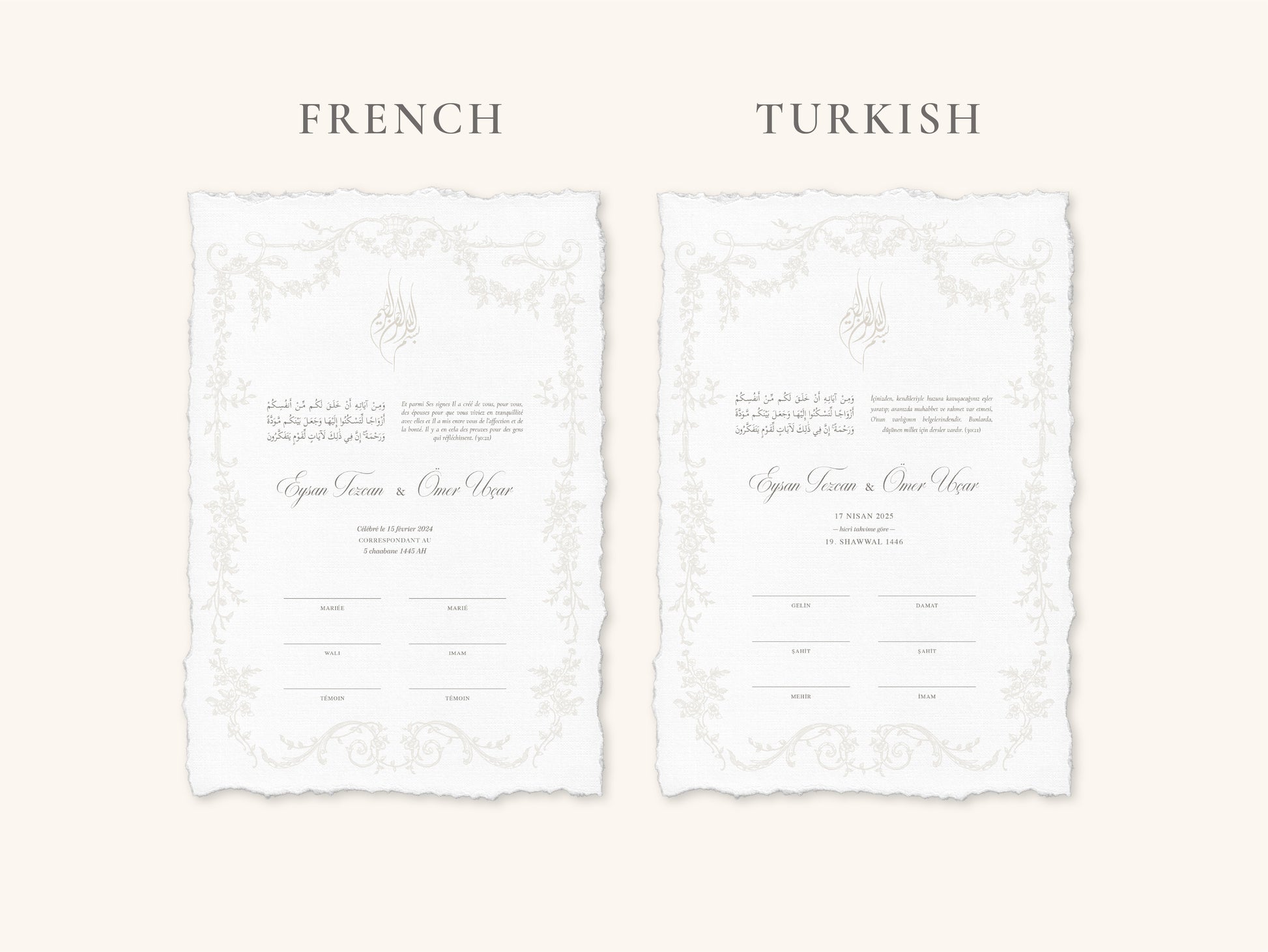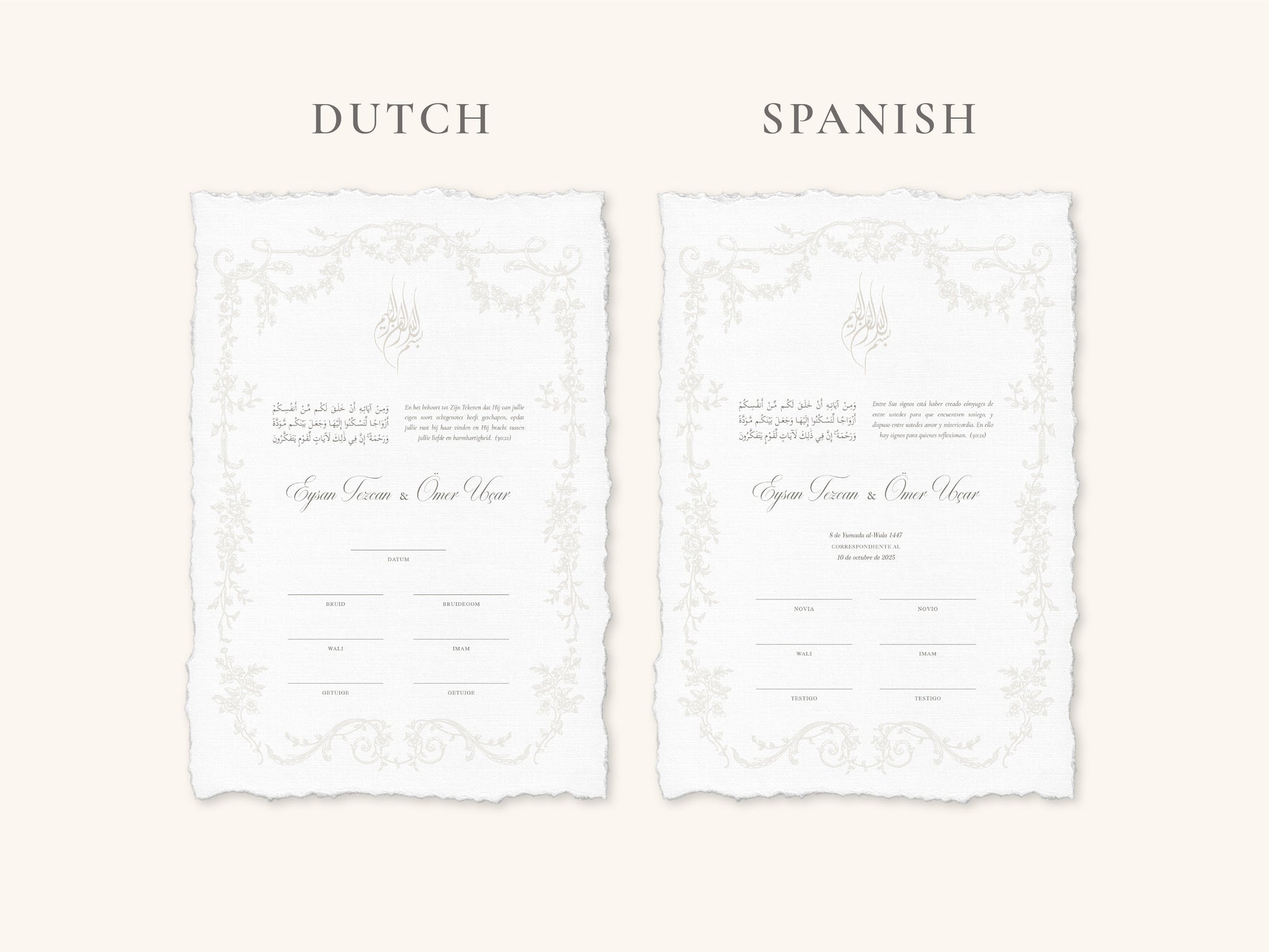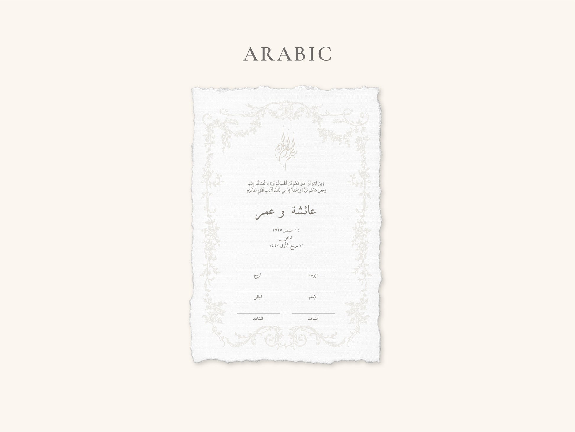 The Bismillah is embossed in a soft beige tone. The Victorian floral border is fully embossed only, without colour, creating an elegant finish.