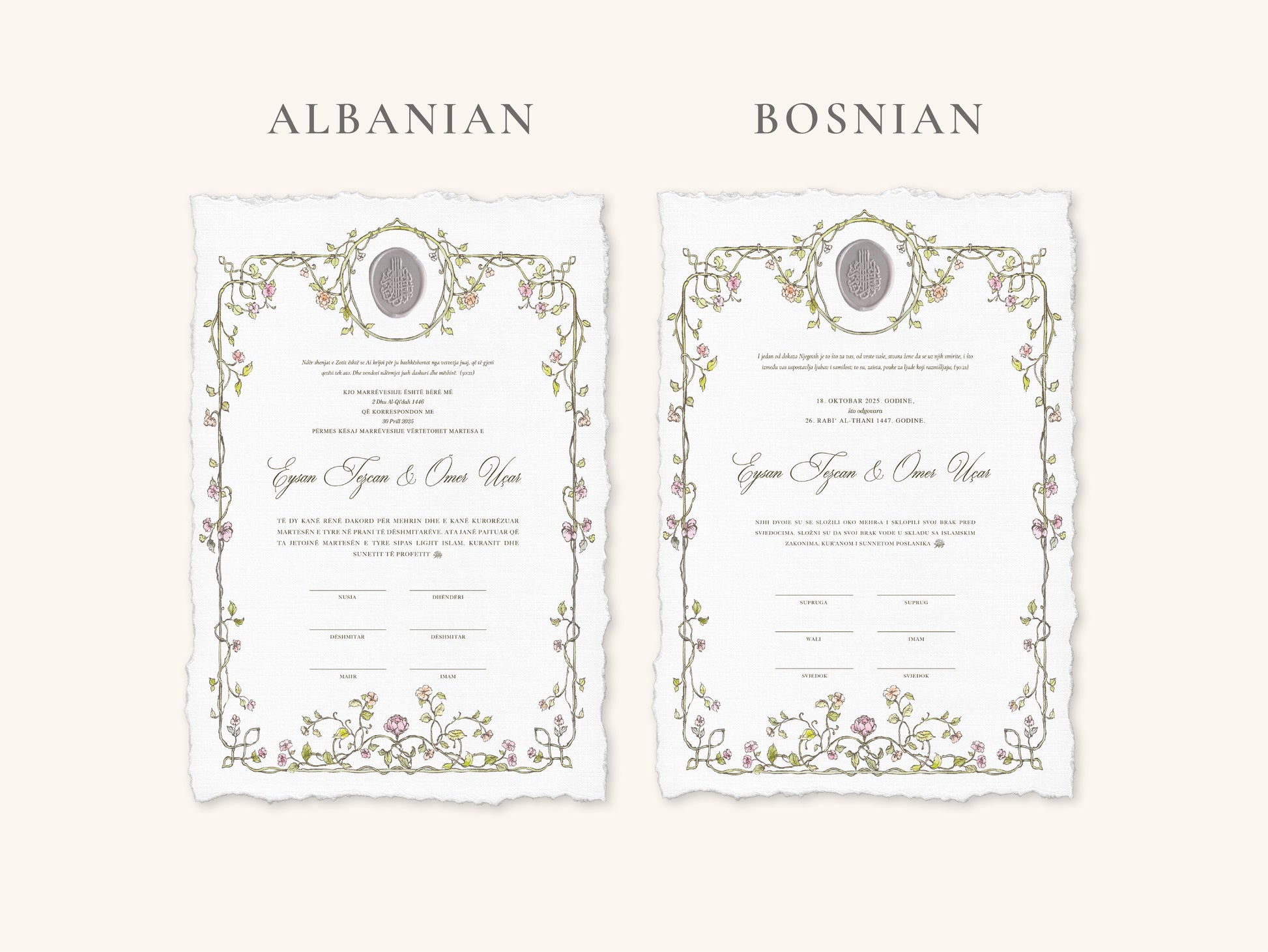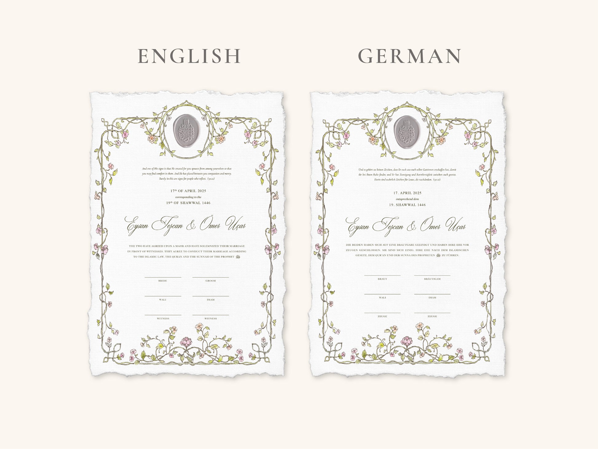 The certificate and folio are provided in DIN A4 size. For DIN A3 certificates, please view our collection “A3 Nikkah Certificates” on our website.